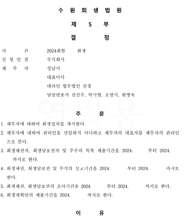 수원회생법원 법인회생 신청사건의 개시결정문