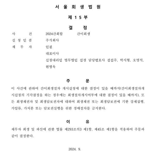 서울회생법원 법인회생 신청사건의 포괄적금지명령 결정문