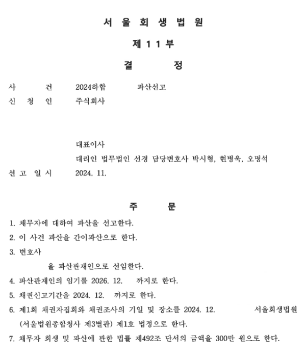 서울회생법원 법인파산 신청사건의 파산선고결정문