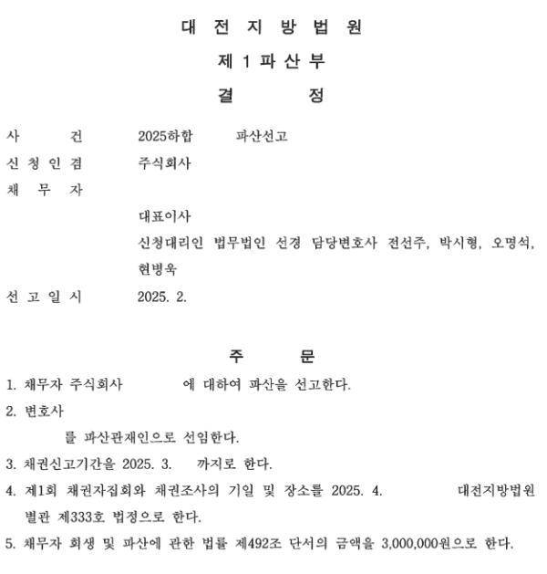 대전지방법원 법인파산 신청사건의 파산선고결정문