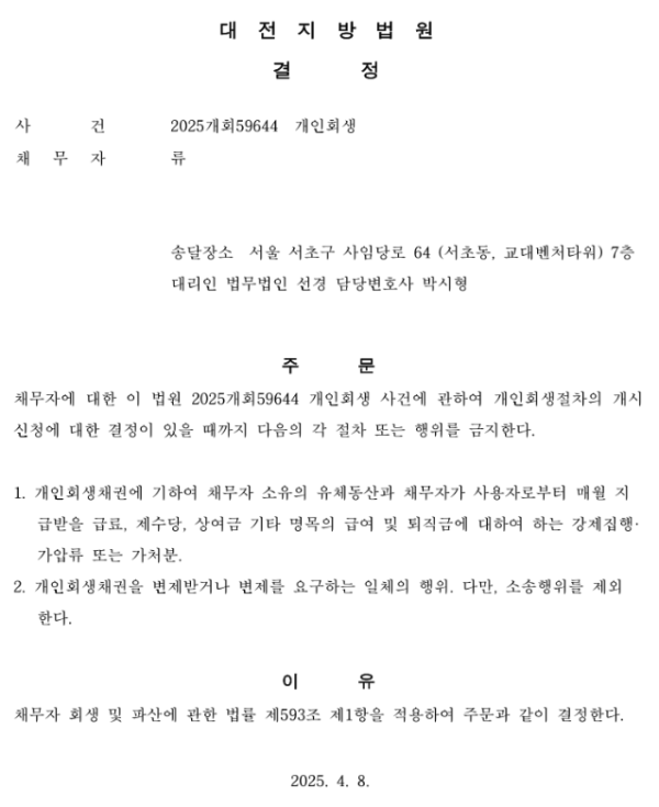 개인회생신청사건의 금지명령 결정문