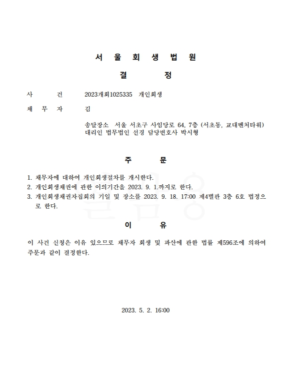 개인회생신청사건의 개시결정문