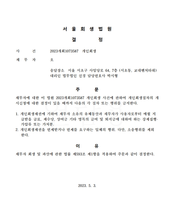 개인회생신청사건의 금지명령결정문