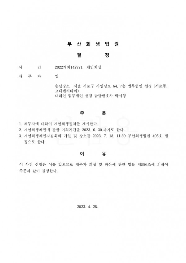 개인회생신청사건의 개시결정문