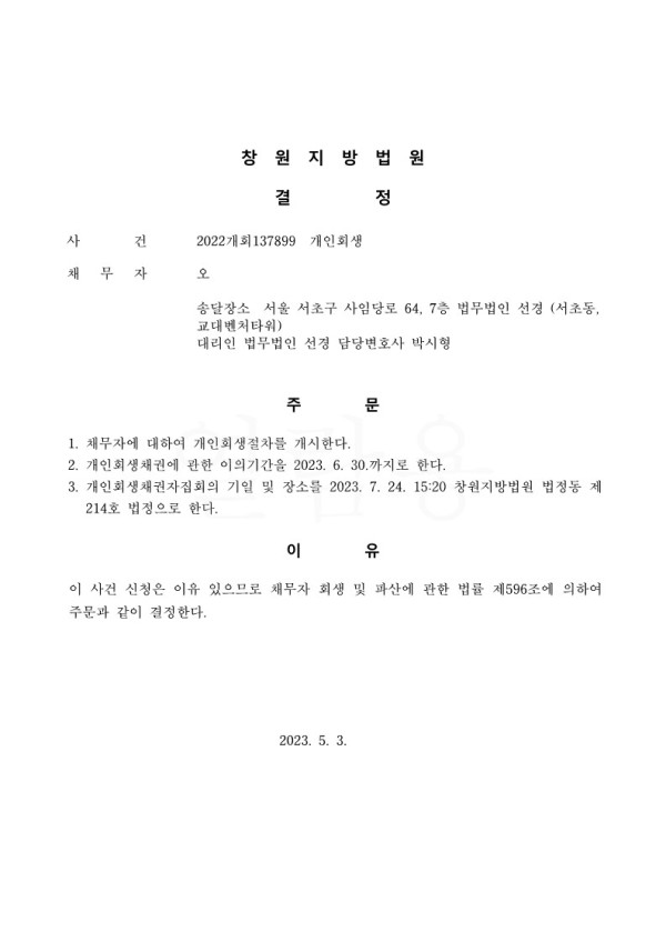 개인회생신청사건의 개시결정문