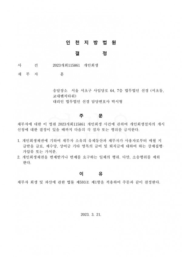 개인회생신청사건의 금지명령결정문