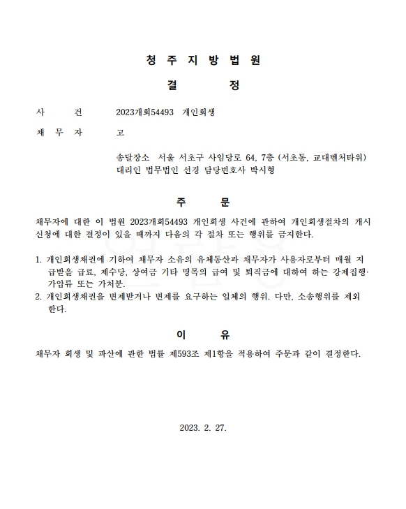 개인회생신청사건의 금지명령결정문