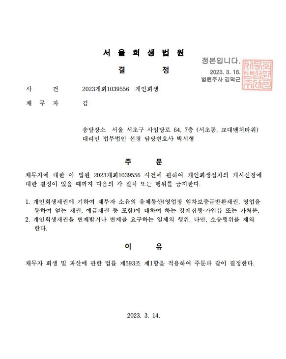 개인회생신청사건의 금지명령결정문