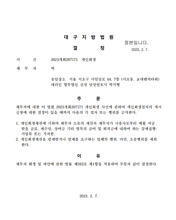 개인회생신청사건의 금지명령결정문