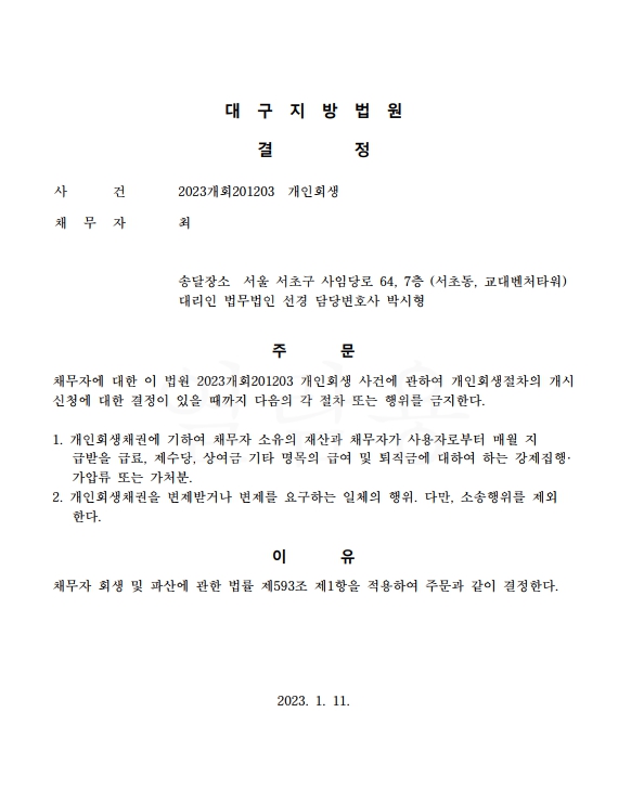 개인회생신청사건의 금지명령결정문