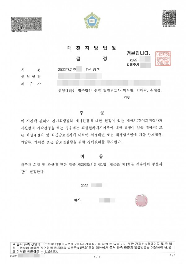 간이회생(개인사업자)절차 포괄적금지명령 결정문