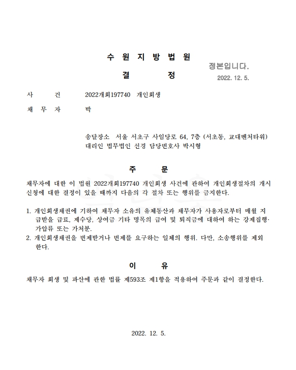 개인회생신청사건의 금지명령결정문