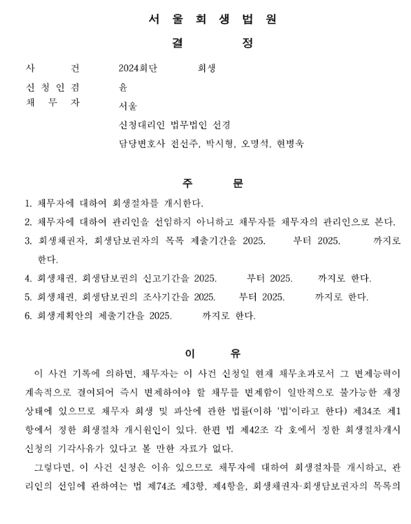 서울회생법원 일반회생신청사건의 개시결정문