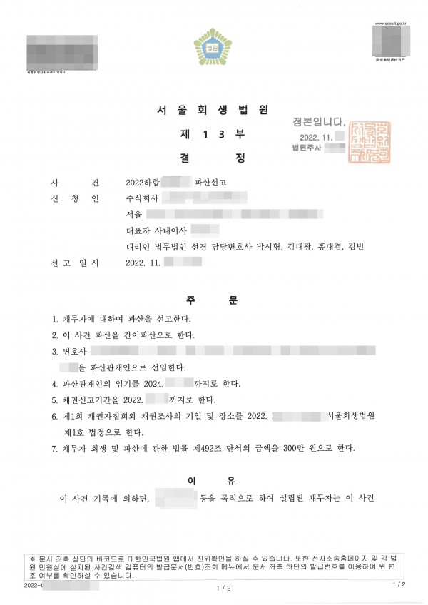 2022. 11. 서울회생법원 법인파산 신청사건의 파산선고결정문