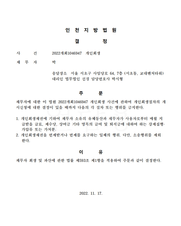개인회생신청사건의 금지명령결정문