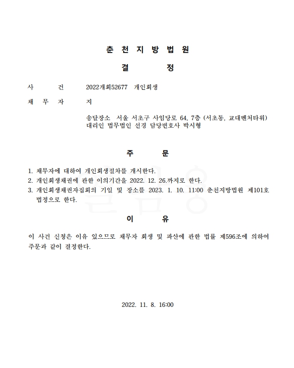 개인회생신청사건의 개시결정문