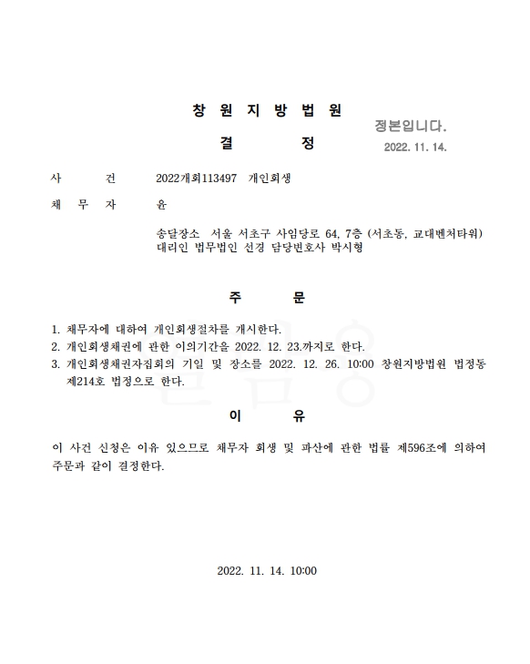 개인회생신청사건의 개시결정문