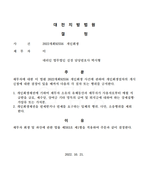 개인회생신청사건의 금지명령결정문