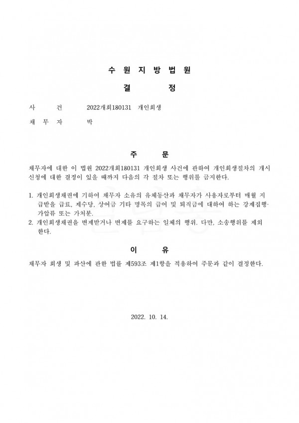 개인회생신청사건의 금지명령결정문
