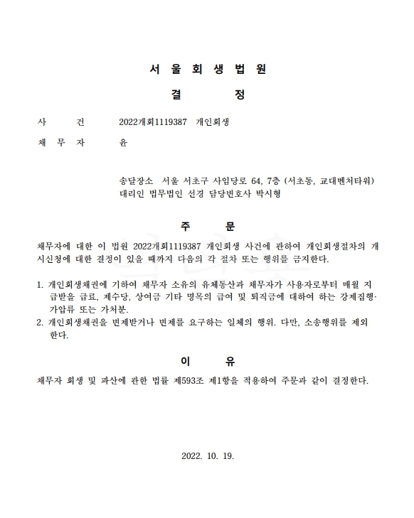 개인회생신청사건의 금지명령결정문