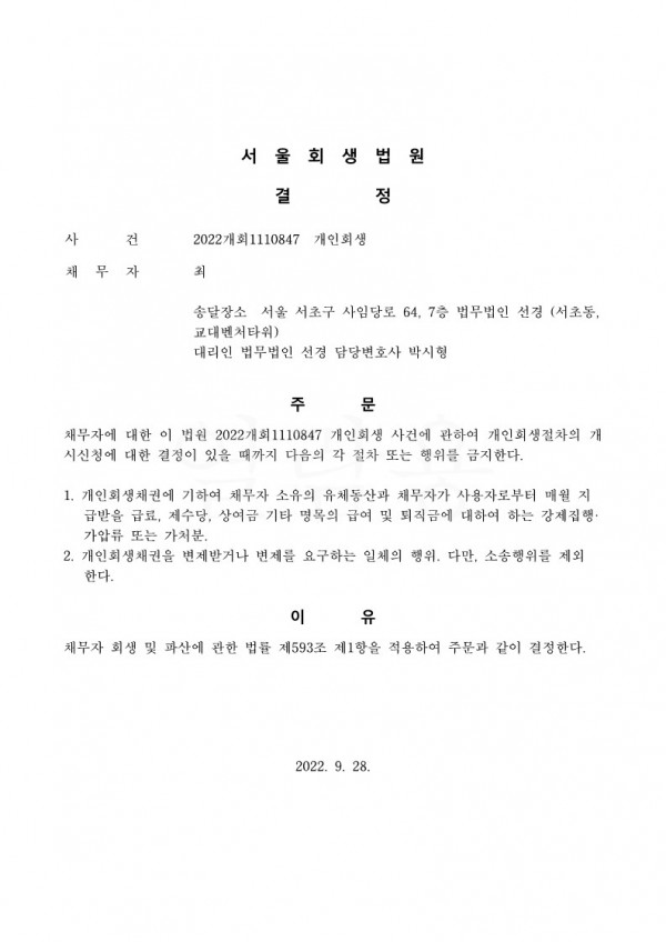 개인회생신청사건의 금지명령결정문