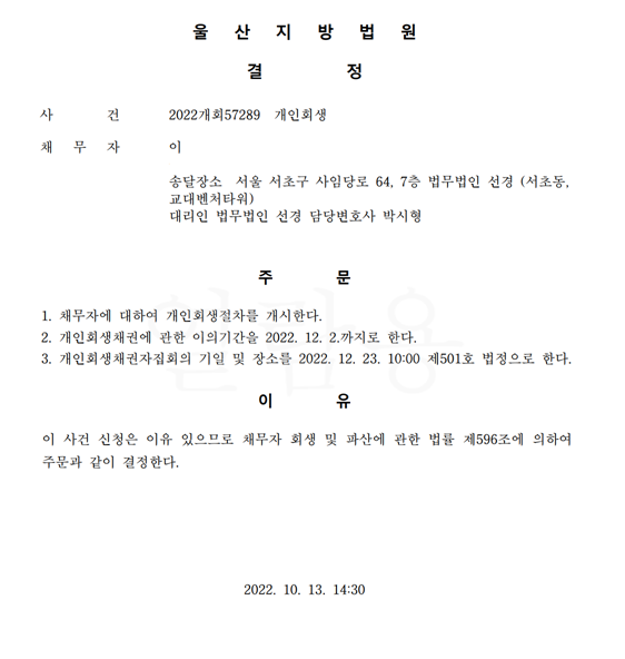 개인회생신청사건의 개시결정문