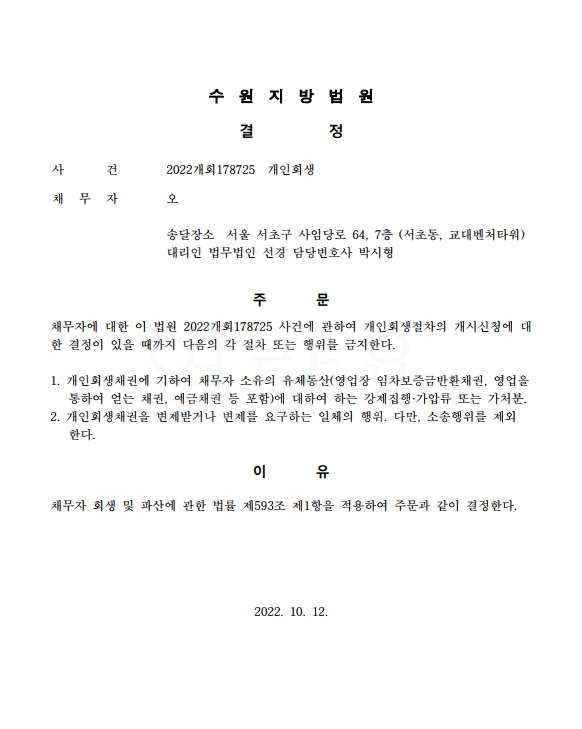 개인회생신청사건의 금지명령결정문