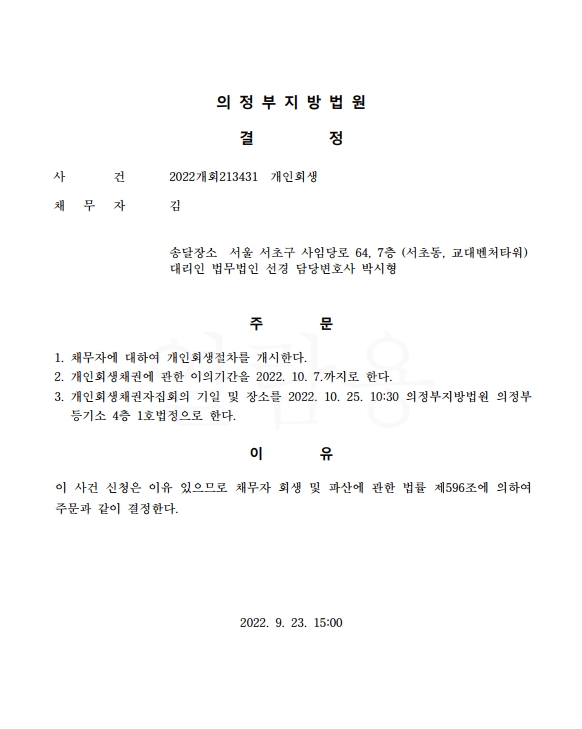 개인회생신청사건의 개시결정문