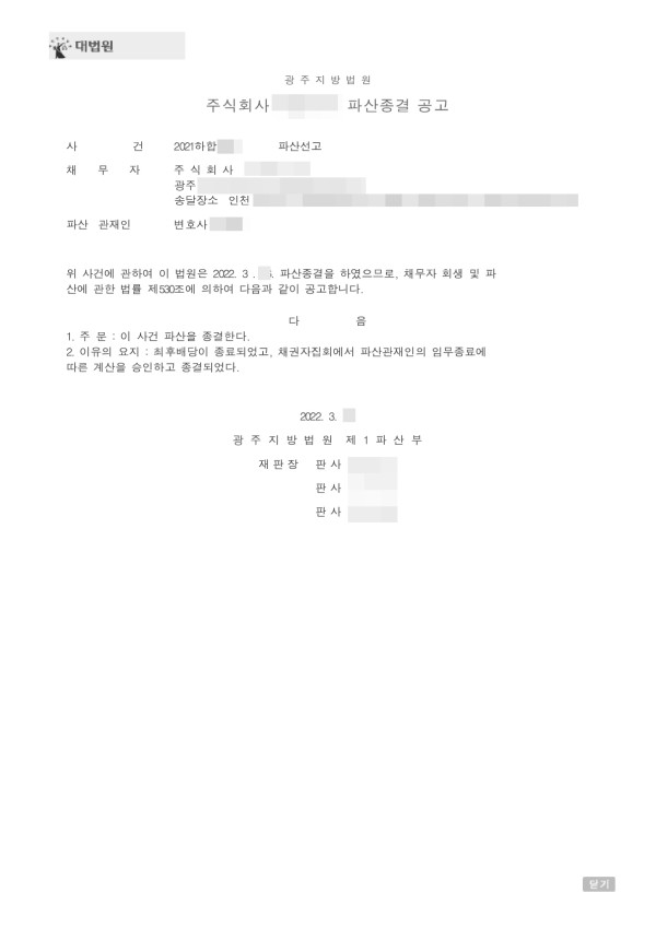 2022. 3. 광주지방법원 법인파산 신청사건의 종결공고문