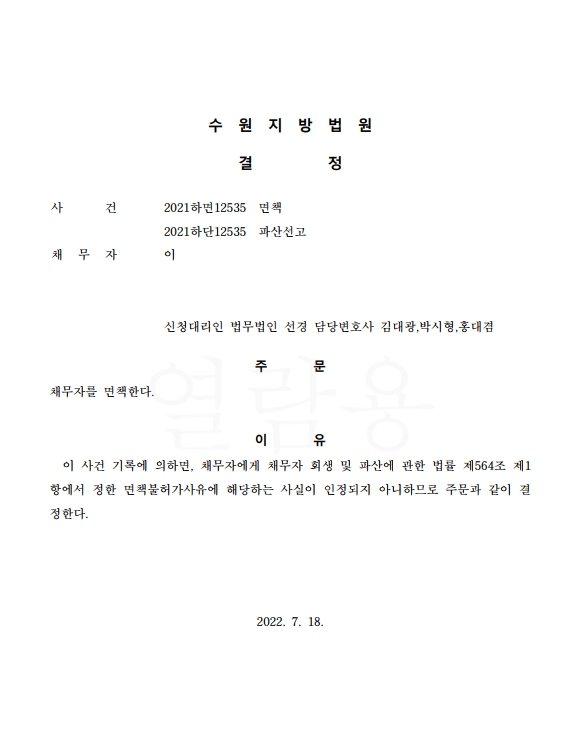 개인파산신청사건의 면책결정문