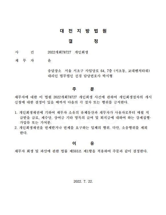 개인회생신청사건의 금지명령결정문