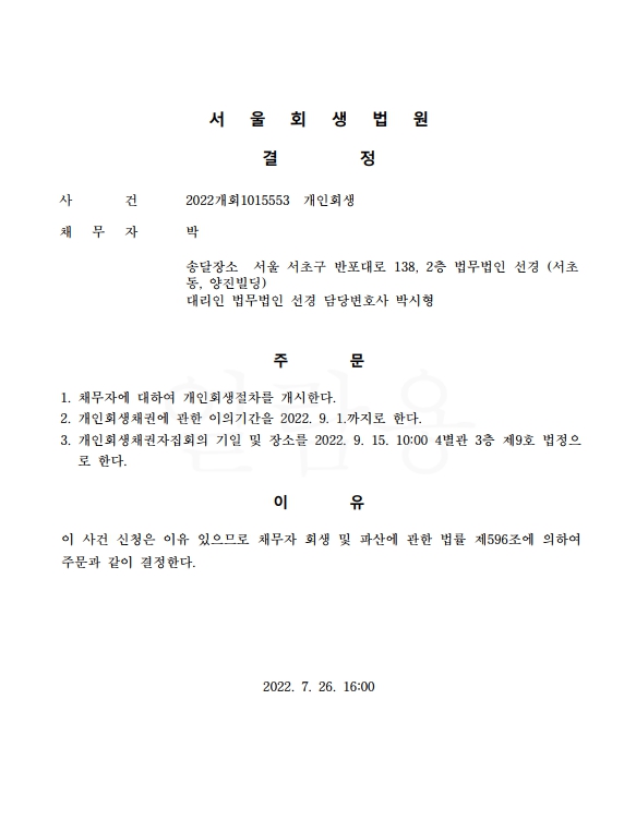 개인회생신청사건의 개시결정문