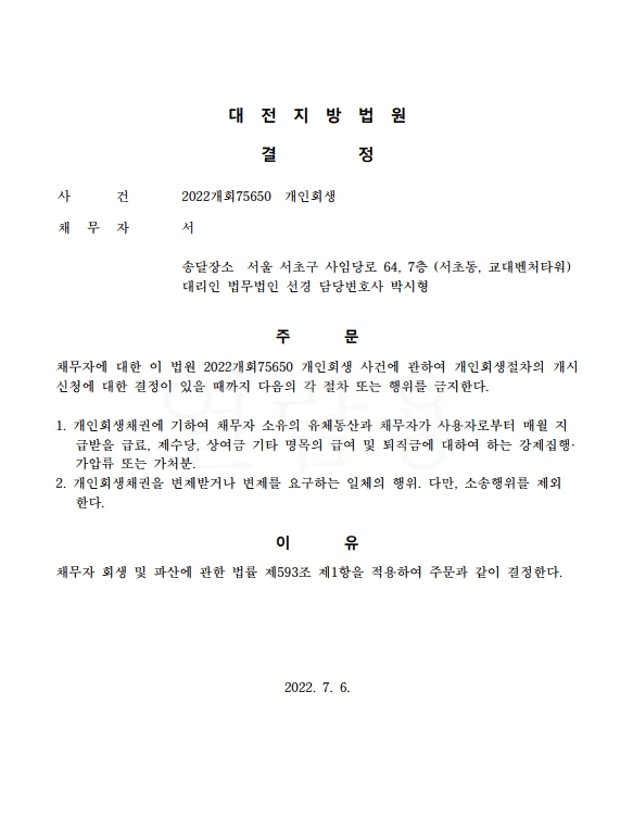 개인회생신청사건의 금지명령결정문
