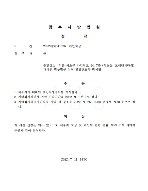 개인회생신청사건의 개시결정문