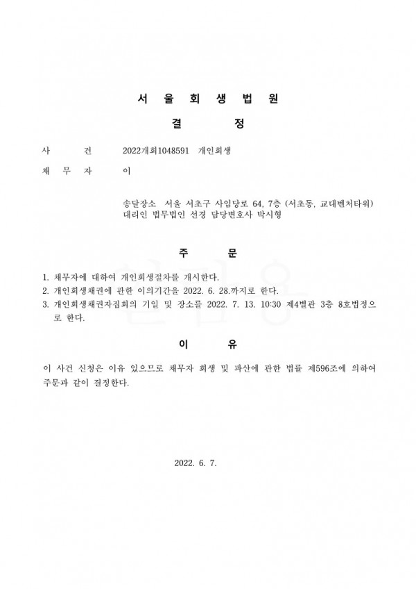 개인회생신청사건의 개시결정문