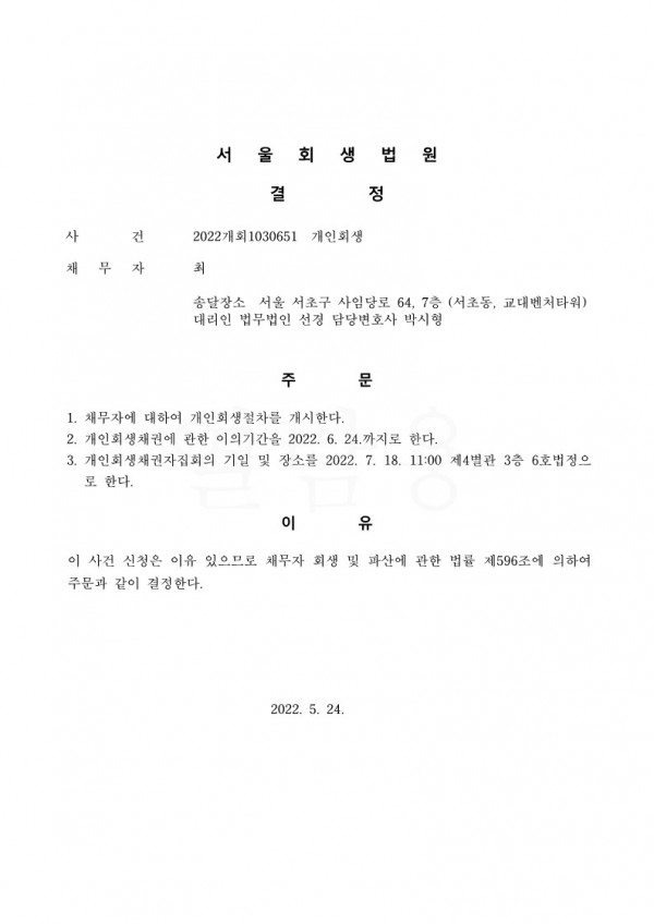 개인회생신청사건의 개시결정문