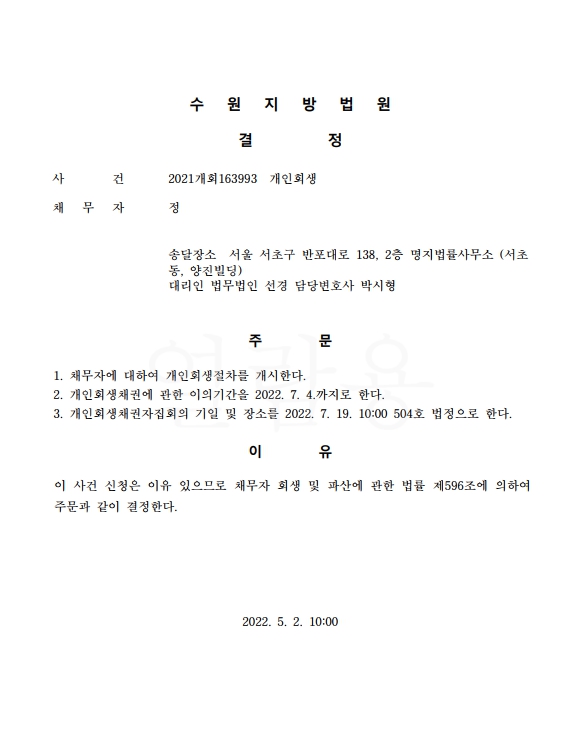 개인회생신청사건의 개시결정문
