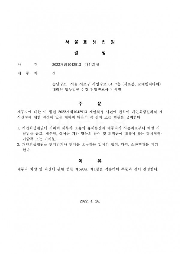 개인회생신청사건의 금지명령결정문