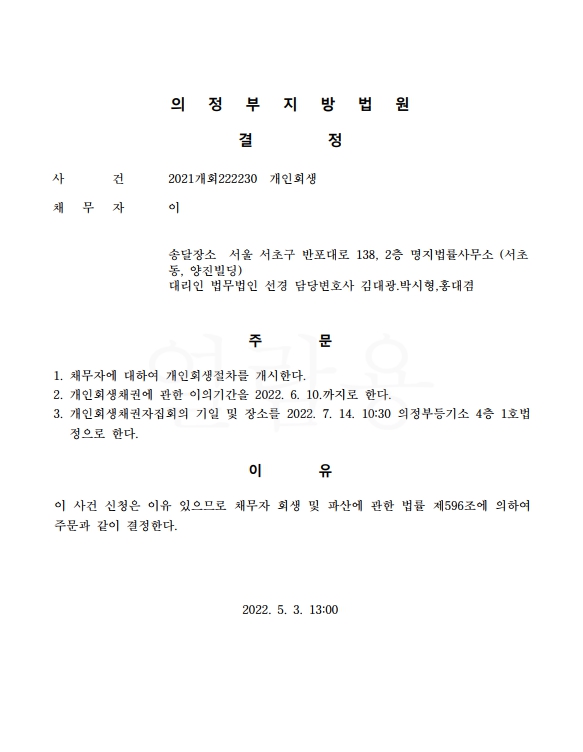 개인회생신청사건의 개시결정문