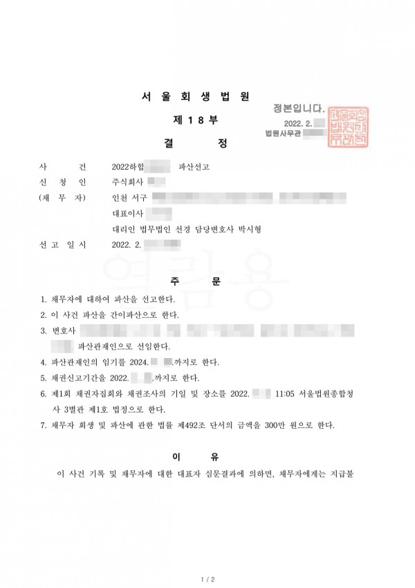 2022. 2. 서울회생법원 법인파산신청사건의 파산선고결정문