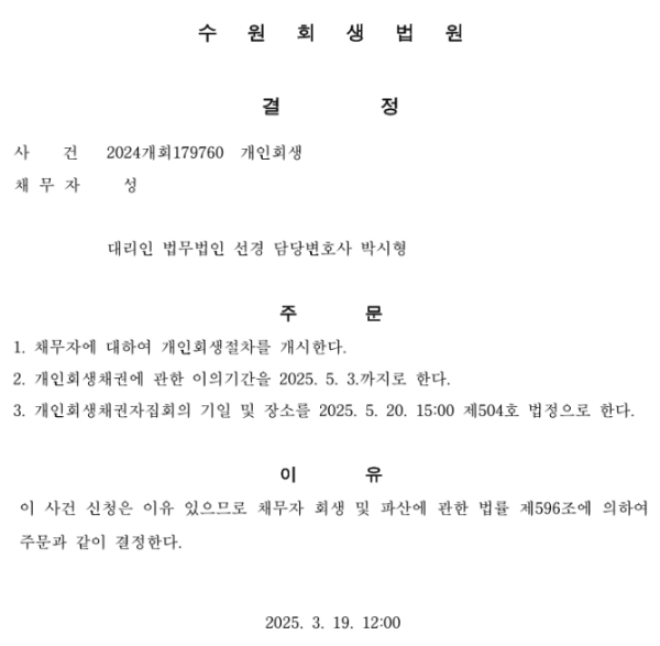개인회생신청사건의 개시결정문