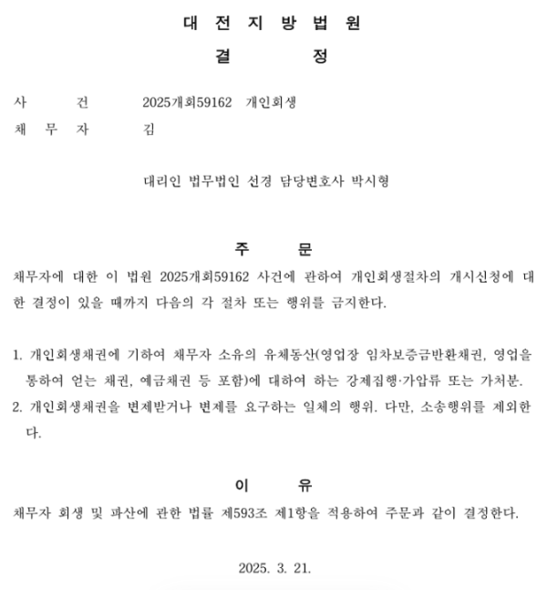 개인회생신청사건의 금지명령 결정문