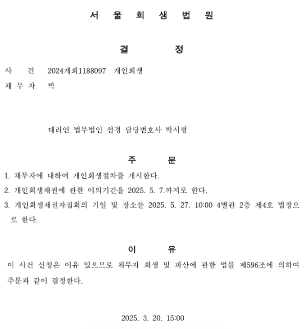 개인회생신청사건의 개시결정문