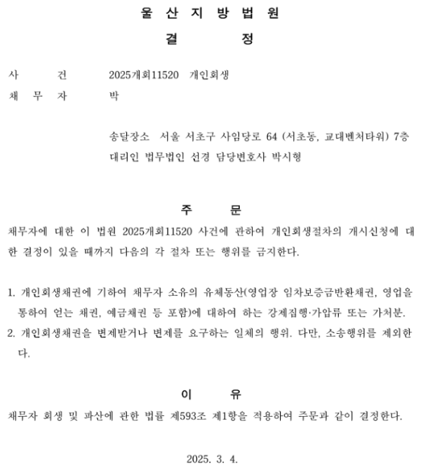 개인회생신청사건의 금지명령 결정문