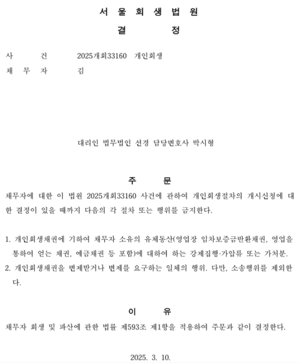 개인회생신청사건의 금지명령 결정문