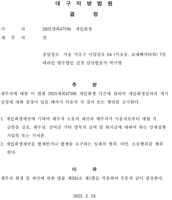 개인회생신청사건의 금지명령 결정문