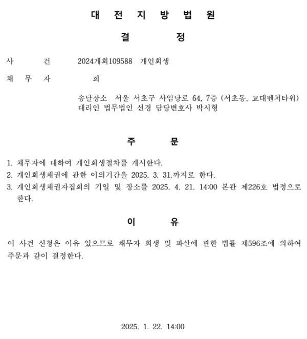 개인회생신청사건의 개시결정문