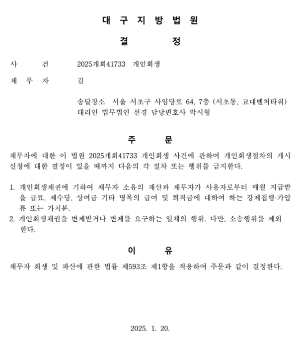 개인회생신청사건의 금지명령 결정문