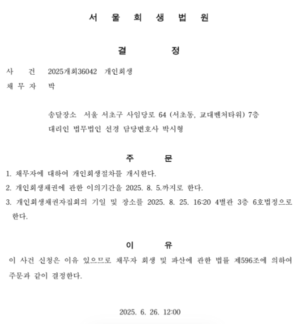 개인회생신청사건의 개시결정문
