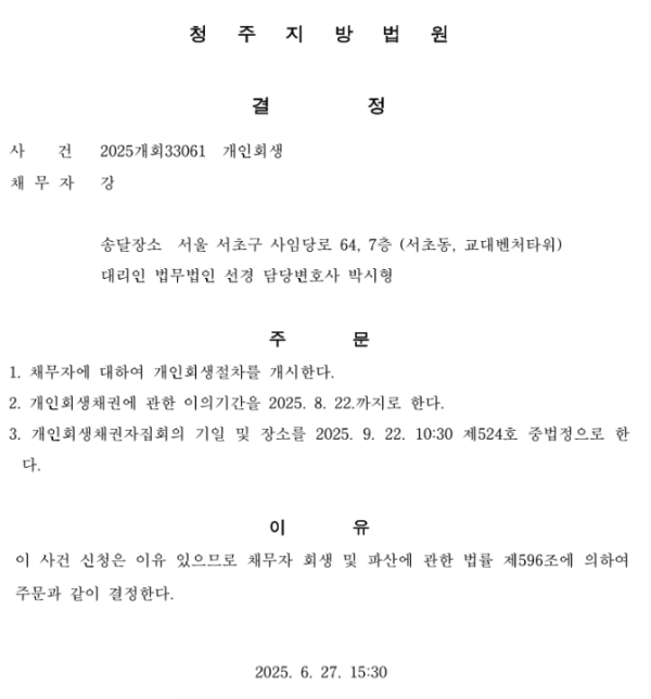 개인회생신청사건의 개시결정문